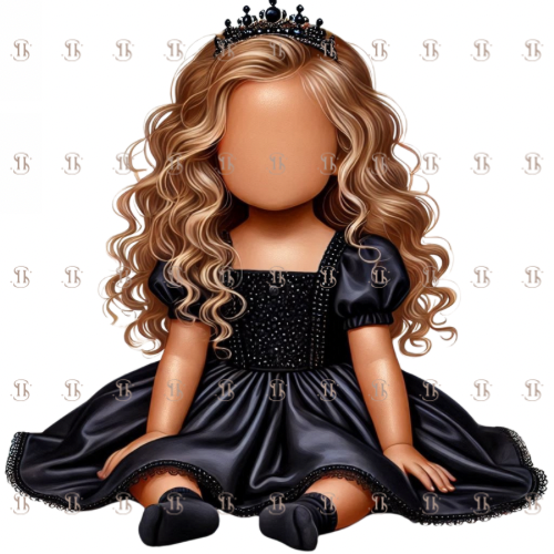 Illustration d’une petite princesse, vêtue d’une robe noire scintillante, portant une couronne délicate sur ses cheveux blonds bouclés.