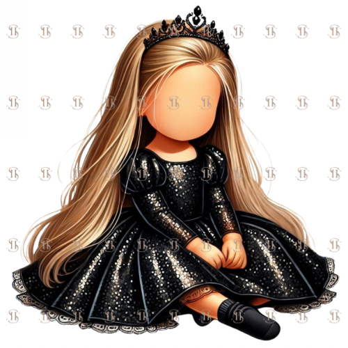 Illustration d’une petite princesse, vêtue d’une robe noire scintillante, portant une couronne délicate sur ses cheveux blonds lisses.