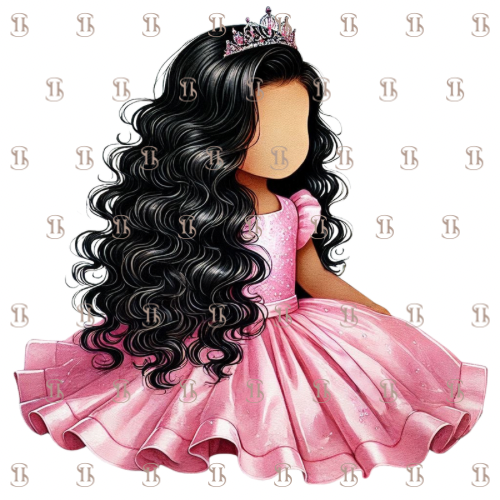 Illustration d’une petite princesse, vêtue d’une robe rose, portant une couronne délicate sur ses cheveux noirs bouclés.