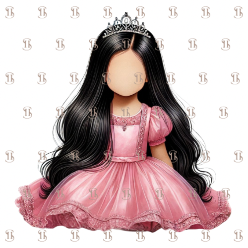 Illustration d’une petite princesse, vêtue d’une robe rose, portant une couronne délicate sur ses longs cheveux noirs lisses.