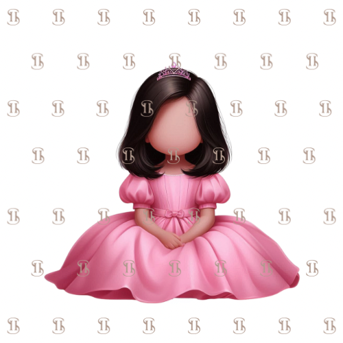 Illustration d’une petite princesse, vêtue d’une robe rose, portant une couronne délicate sur ses cheveux noirs courts et lisses.