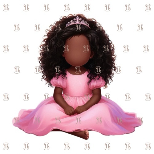 Illustration d’une petite princesse peau foncée, vêtue d’une robe rose, portant une couronne délicate sur ses cheveux noirs bouclés.